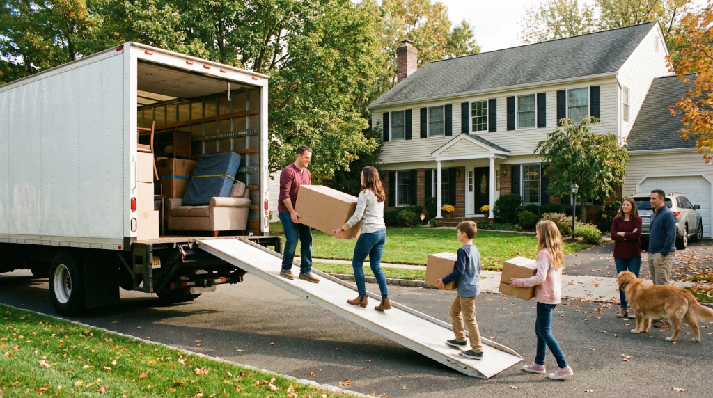 Family loading a moving truck in a suburban neighborhood