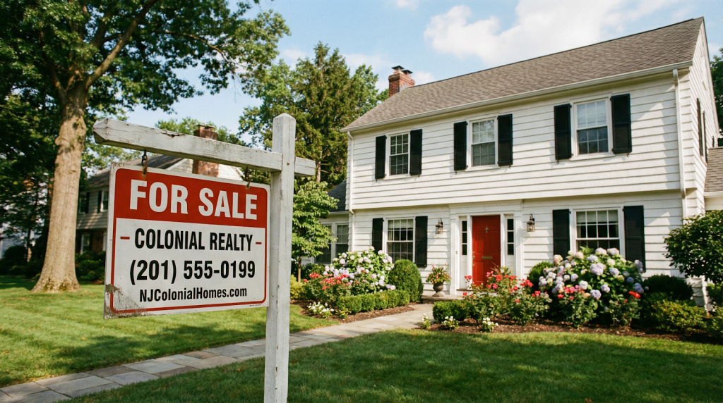 For sale sign in front of a well-maintained NJ home