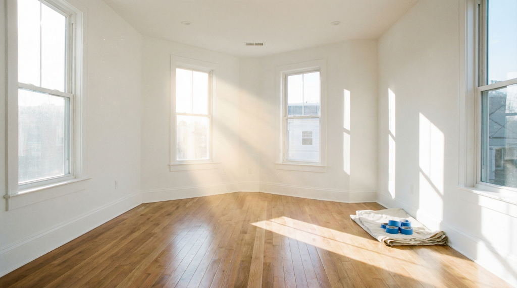 A bright, clean, and empty room that has been recently cleared and is now ready for renovation. Sunlight streams through the windows, illuminating the fresh paint and clean floors. The room should look spacious and full of potential, symbolizing a fresh start. The style should be bright, airy, and optimistic.