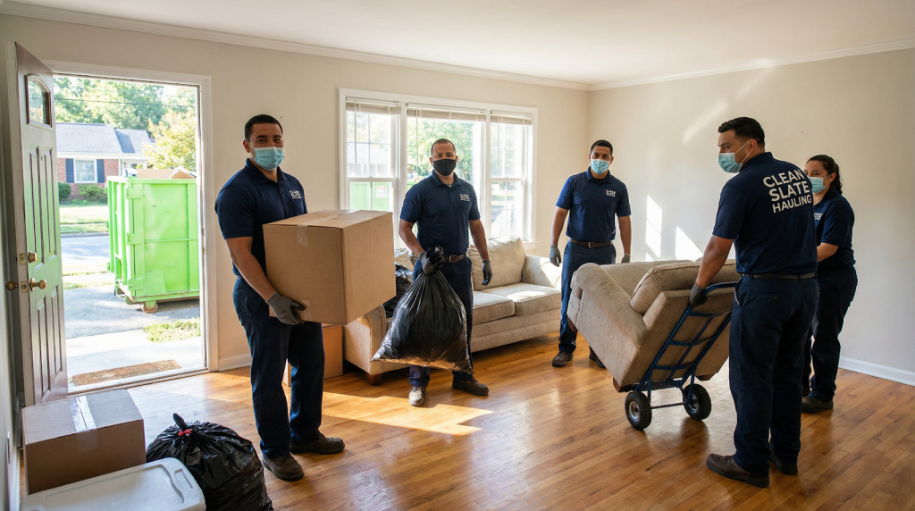 A professional cleaning crew in uniform, working diligently to clear out a hoarder house. They are wearing masks and gloves, and are systematically removing junk and debris. The image should project a sense of hope and progress, with more light and space becoming visible as they work. The style should be realistic and positive.