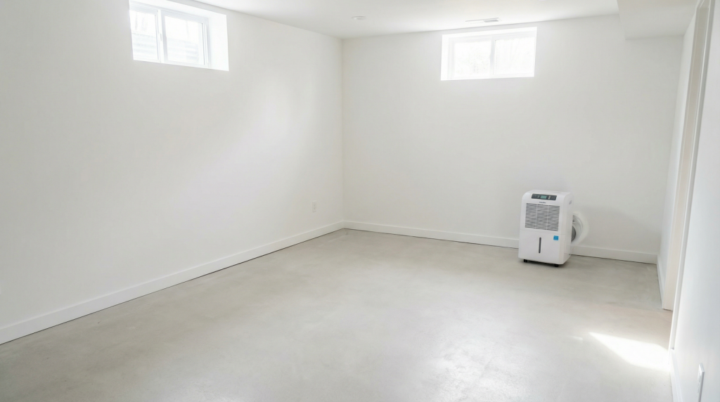 A bright, clean, and completely renovated basement after successful mold remediation.